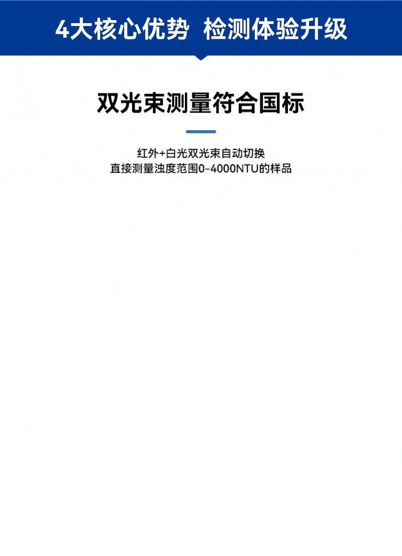 2、白光+紅外雙光束自動切換,可直接測量濁度范圍0-4000NTU的樣品;