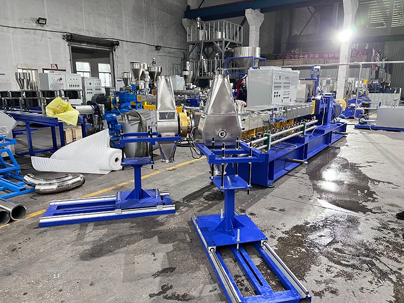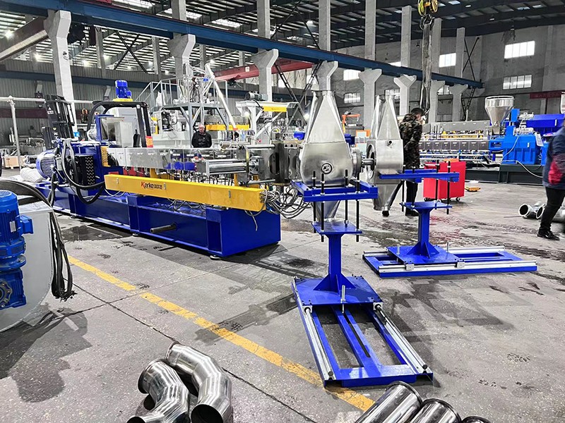 生產KTE-75D三螺桿鹽白填充母粒,一機雙切,產量為3000Kg/h。